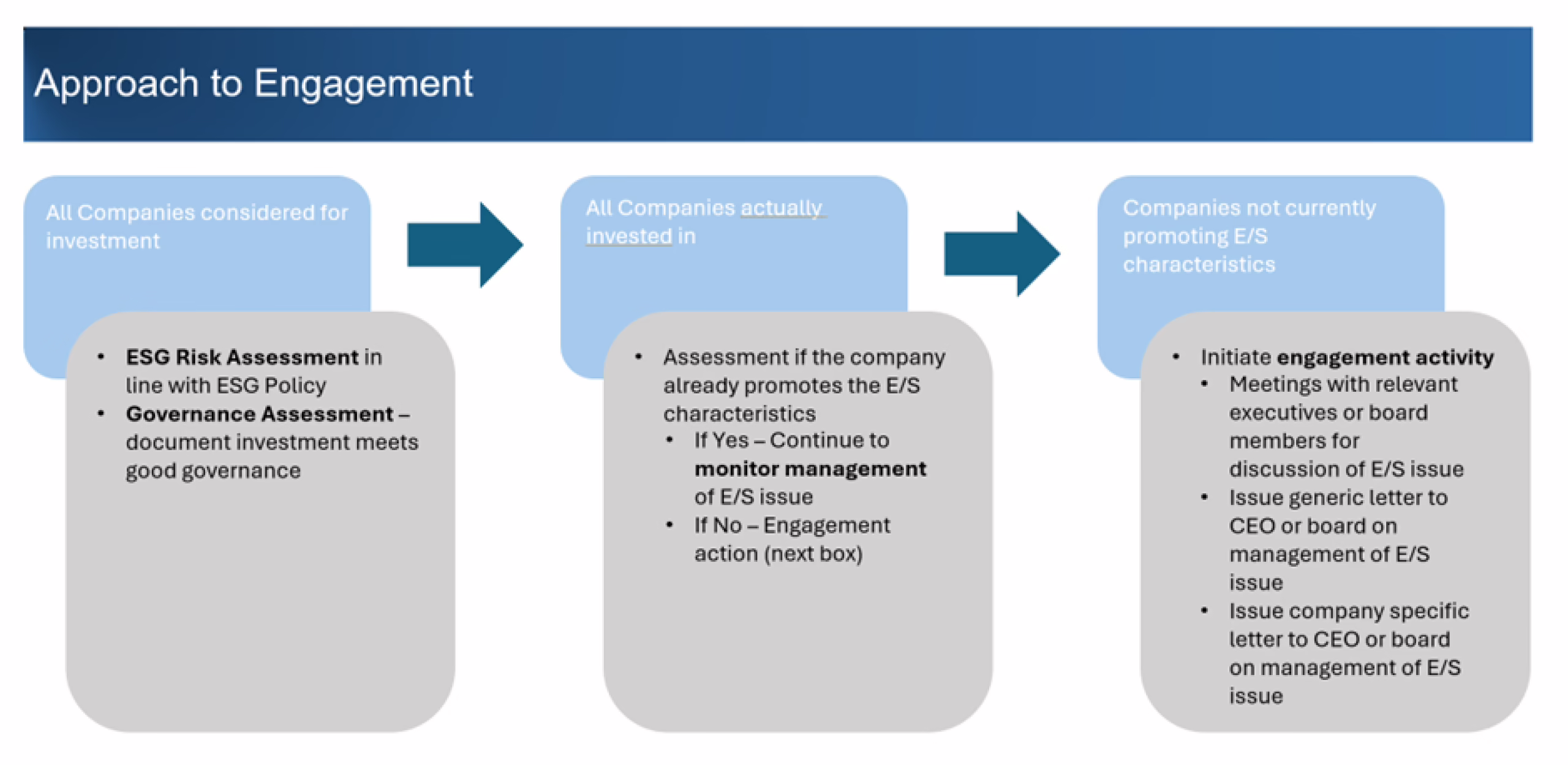 For specific products, where relevant, the Firm will report on the number of company engagements relevant to the particular thematic issues, including detail on outcome: acknowledgement from the company that topic management requires increased focus; action on improved process to manage the specific issue; improved disclosure on the management of the specific issue.